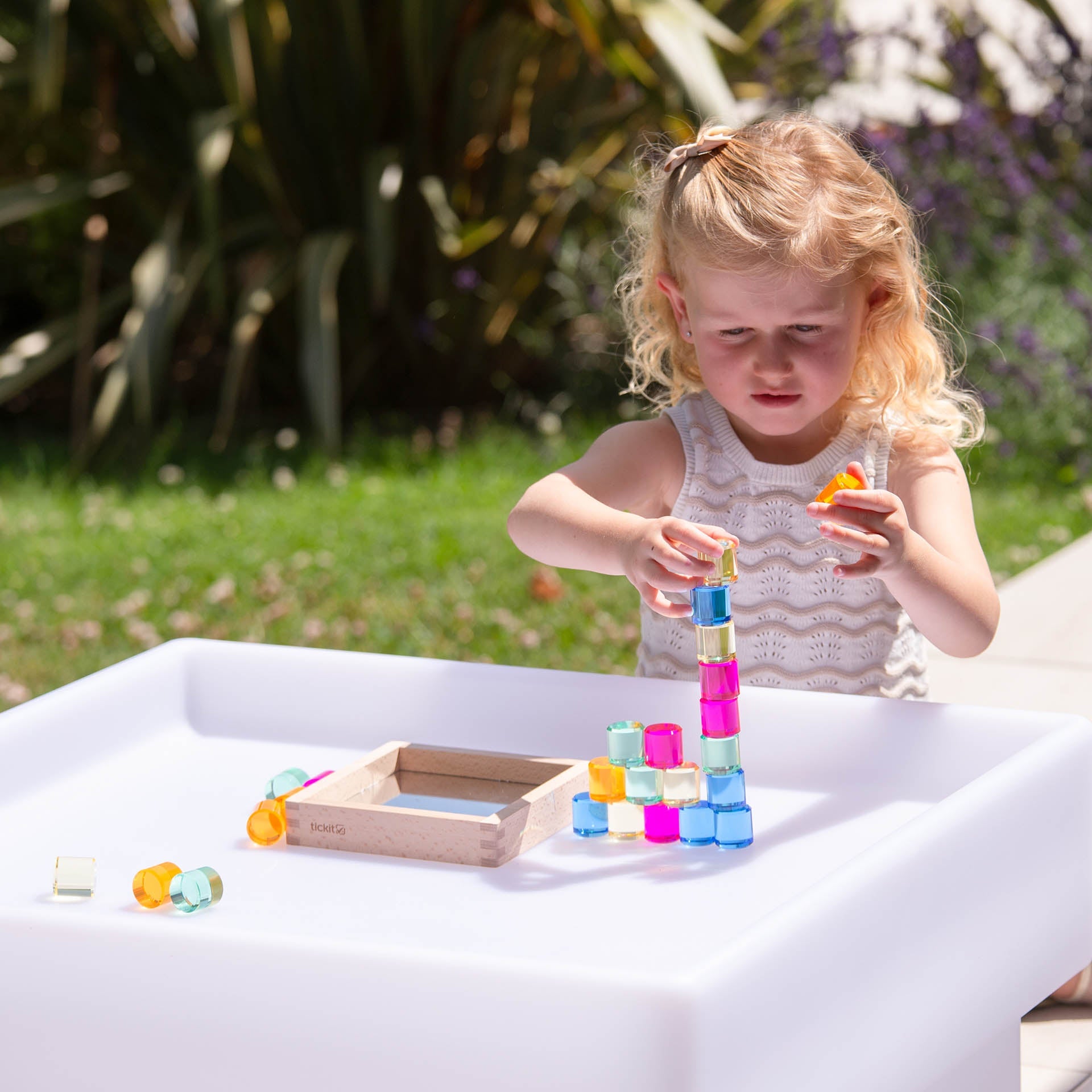Unlock endless possibilities with this captivating gem circle collection. Fifty translucent acrylic cylinders in five radiant colours rest within an FSC-certified beechwood tray boasting a mirrored acrylic base that amplifies light into a spectacular rainbow display. Each gem features perfectly smooth edges and a satisfying tactile quality, creating delightful musical tones when rolled and shuffled together. As light passes through the gems and bounces off the mirrored foundation, children witness mesmerising internal reflections and prismatic effects that spark wonder and curiosity.