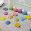 Sættet inkluderer: 14 træskiver i 7 forskellige regnbuefarver (2 af hver farve).