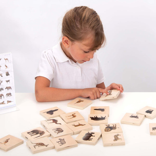 Et sjovt og alsidigt træspil, vores tickit® Wild Animal Family Match er et sæt på fjorten par glatte, taktile basswood-fliser med et klart farveprint på den ene side af rigtige fotografiske billeder af voksne vilde dyr og deres unger. De firkantede chunky fliser er nemme for dit barn at holde og vende i hænderne.