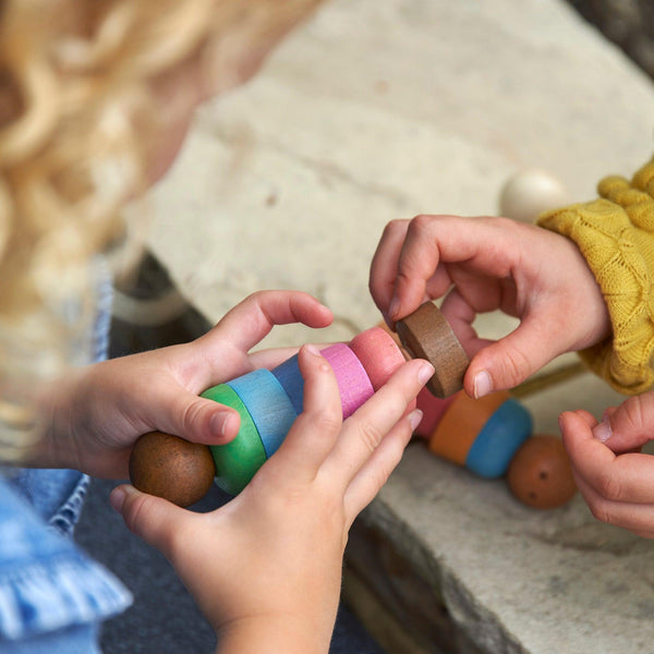 Die aufgefädelten Figuren bestehen aus wunderschönem, glattem, massivem Buchenholz mit einer natürlichen Holzmaserung und repräsentieren eine vielfältige Palette von 5 verschiedenen Hauttönen. Die Körper können mit regenbogenfarbenen Manschetten, die sich leicht anziehen lassen, fantasievoll gekleidet werden.