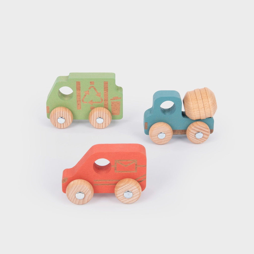 Im Set enthalten: 3 farbige Holzfahrzeuge.