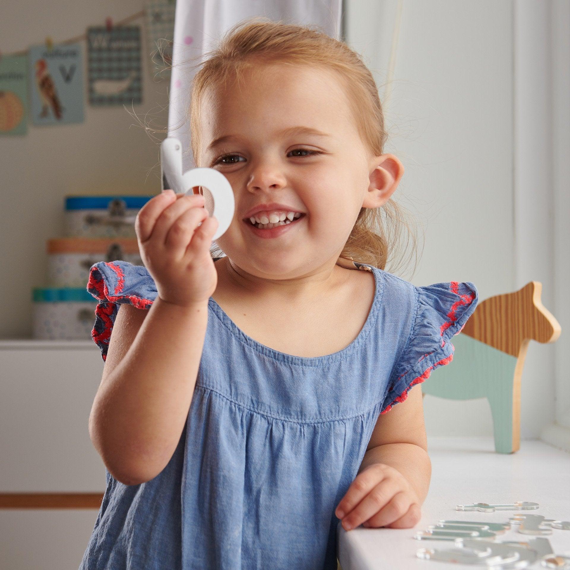 tickit® Mirror Letters sind lasergeschnittene doppelseitige Kleinbuchstaben aus hochreflektierendem, sicherem Acryl in einer klaren, kinderfreundlichen Schriftart, wodurch sie sich ideal für die Buchstabenerkennung und das Erlernen des Alphabets eignen. Ihre taktilen und reflektierenden Eigenschaften fesseln die Aufmerksamkeit Ihres Kindes und ermutigen es, die Form der Buchstaben mit dem Finger auf der glatten Oberfläche nachzuzeichnen. Jeder Buchstabe hat oben ein Loch, damit Sie hängende Buchstabendisplays oder Mobiles erstellen können.