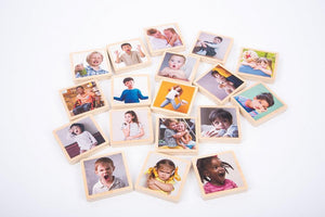 Tijdens mijn observatie merkte ik een gebrek aan woordenschat in verband met emoties. De meeste kinderen noemden alleen verdrietig, blij of bang. Het gebruik van een spiegel en de houten tegels zorgde voor gesprekken over emoties en de introductie van nieuwe woordenschat. Het duurde niet lang of een paar kinderen begonnen hun herinneringen te delen over wanneer ze een emotie hadden gevoeld, die ze op een van de tegels herkenden. Door de gesprekken die volgden, vergrootten de kinderen hun woordenschat door hun ervaringen en gevoelens daaraan toe te schrijven op de tegel. Het gebruik van afbeeldingen van echte kinderen was in dit voorbeeld enorm nuttig omdat ze zo herkenbaar waren voor de kinderen.