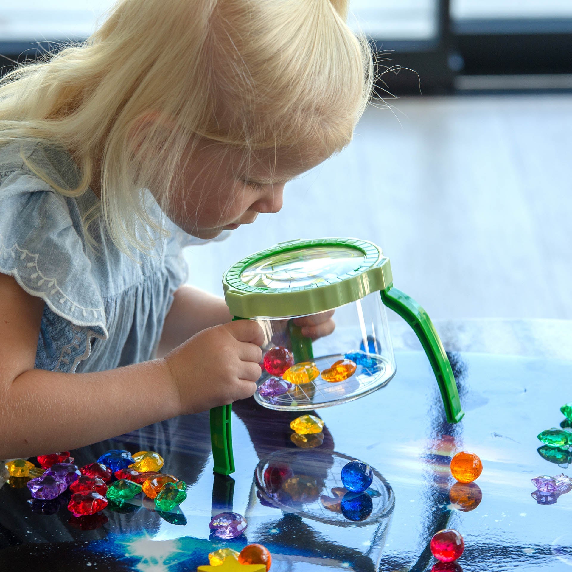 This brilliant magnifier brings a splash of discovery to any learning space! Featuring a sturdy tripod base that can be set up quickly, it delivers a satisfying 2x magnification for exploring tiny treasures.