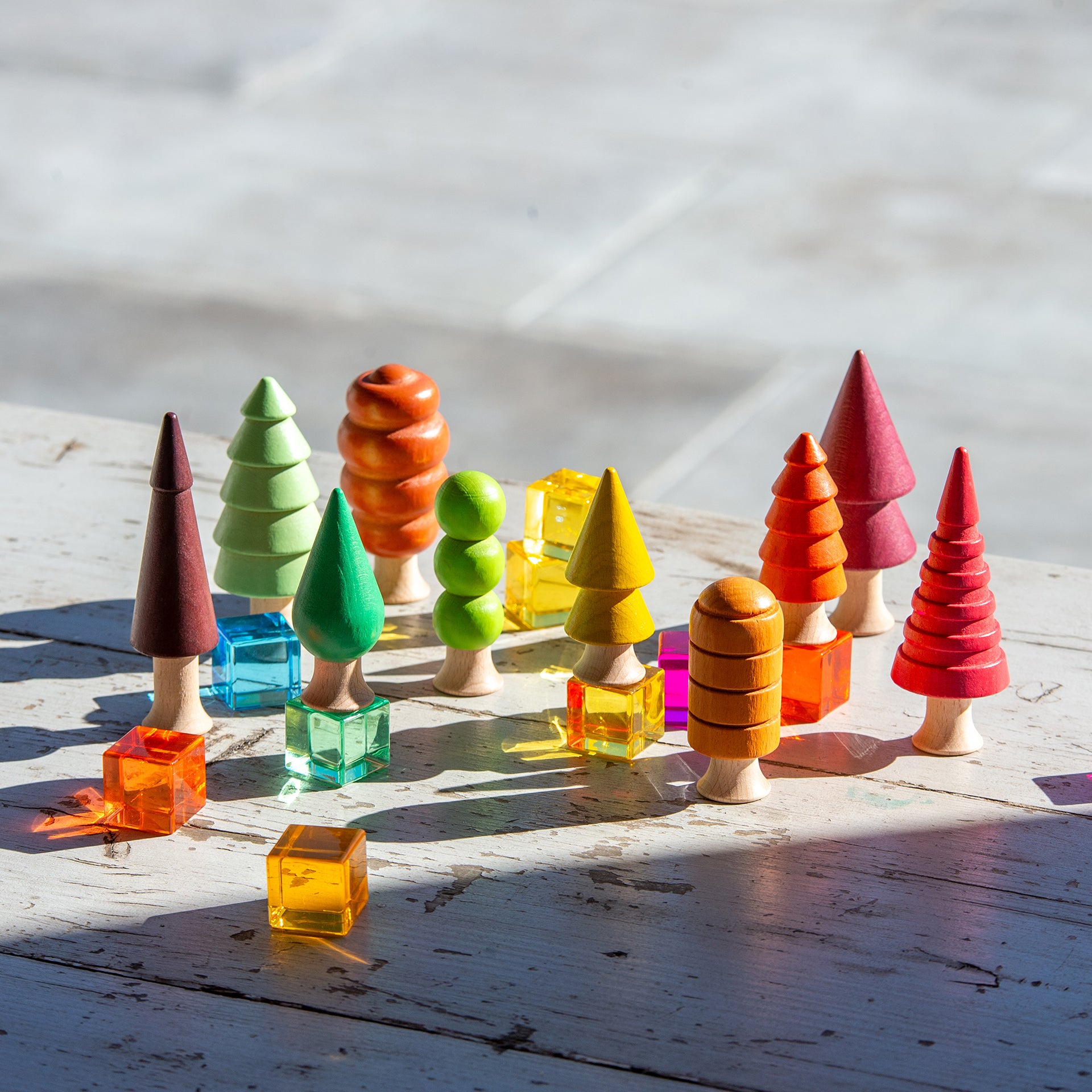 De 10 verschillende gevormde bomen zijn in verschillende maten en hebben natuurlijke tinten van bruin, groen, rood, oranje en geel. Ideaal voor kleine wereldspellen, het ontwikkelen van beschrijvende woordenschat, het verkennen van overeenkomsten en verschillen en het bevorderen van vergelijkende of fantasierijke taalvaardigheden.