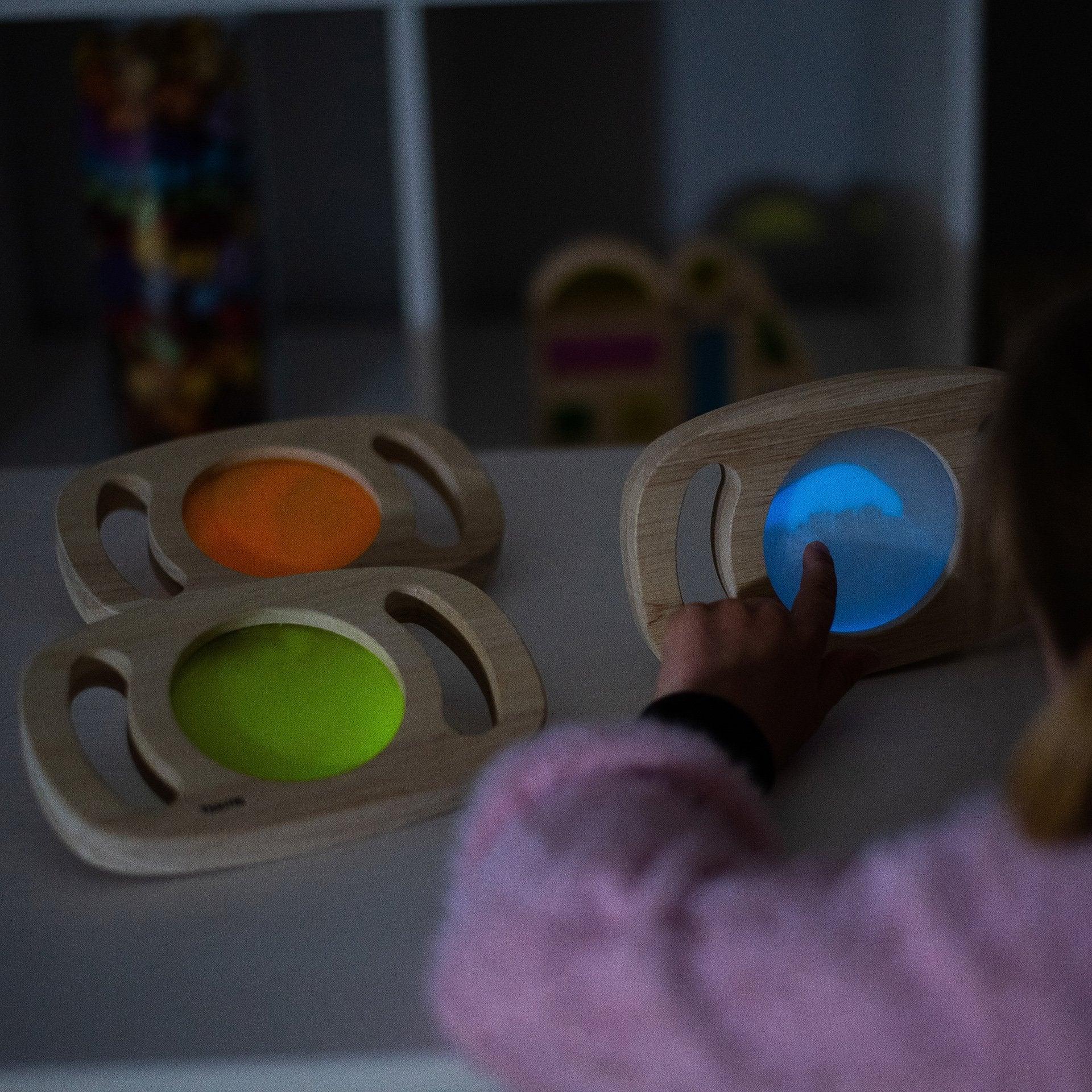 tik het® Easy Hold Glow Panels hebben frames van massief rubberhout met gemakkelijk vast te houden handvatten, waarin verschillende kleurrijke glow-in-the-dark inzetstukken zitten die uw kind zullen fascineren en hem zullen helpen op een unieke manier met de wereld om hem heen om te gaan. De lichtgevende oranje, blauwe of groene panelen bieden een nieuw magisch, levendig en zintuiglijk perspectief op hun omgeving, en wanneer ze worden gedraaid en gedraaid, wervelt de gloeiende vloeistof om boeiende bewegingen te creëren. Perfect voor zintuiglijke ontdekkingen en het stimuleren van beschrijvende woordenschat.